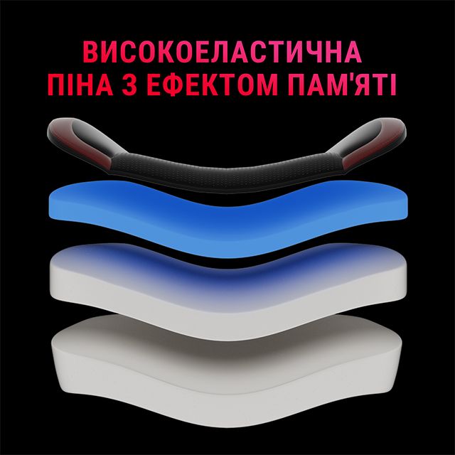 Завдяки тому, що було досягнуто золотої середини між підголівником і поперековою подушкою, покращилася підтримка зон на тілі, які найбільше схильні до стресу та ризику деформації. Така конструкція робить крісло комфортним та покращує продуктивність користувача. Підголовник має ефект пам'яті.